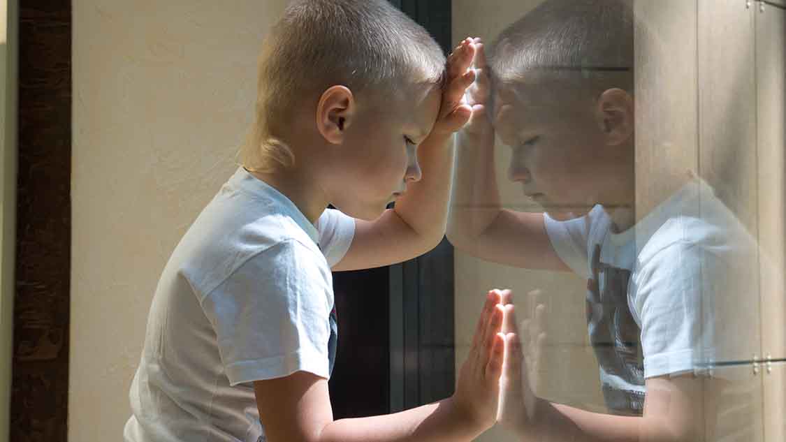 Einsames Kind blickt durch eine Fensterscheibe.