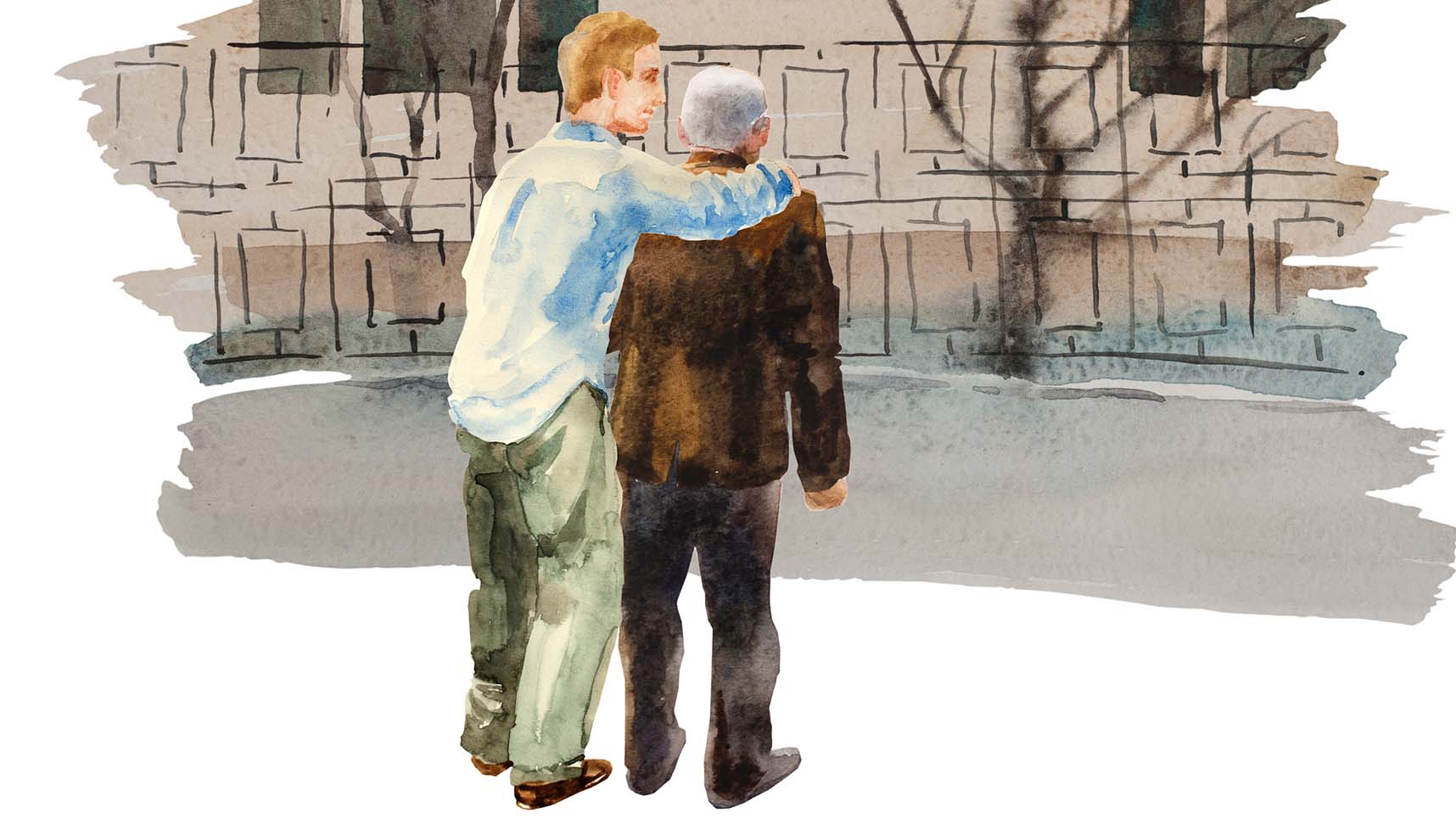 Zeichnung von einem jungen Mann, der einen alten Mann hält und führt.
