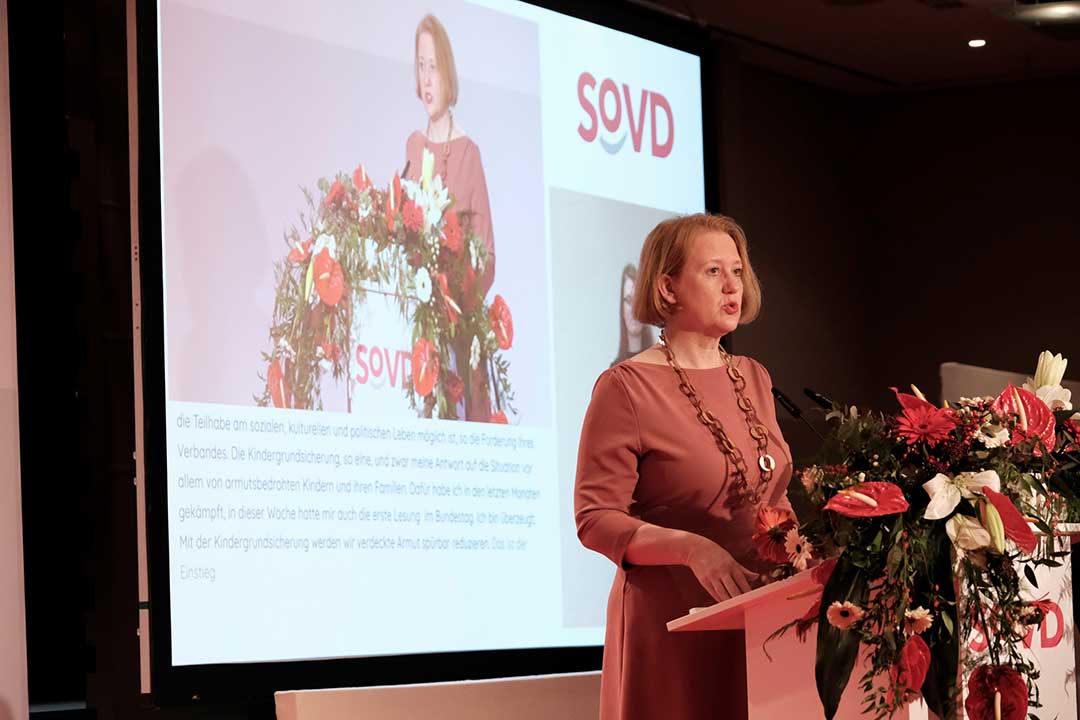 Die SoVD-Vorstandsvorsitzende Michaela Engelmeier begrüßte anschließend die geladenen Gäste aus Politik und Verbänden, darunter Familienministerin Lisa Paus (Die Grünen), Adrian Hille aus dem Bundeskanzleramt, Andreas Wallenborn, Geschäftsführer des VdK, Lisi Maier von der Bundesstiftung Gleichstellung, Yvonne de Andrés vom Deutschen Frauenrat sowie Karin Schwendler und Markus Fuß von ver.di.
