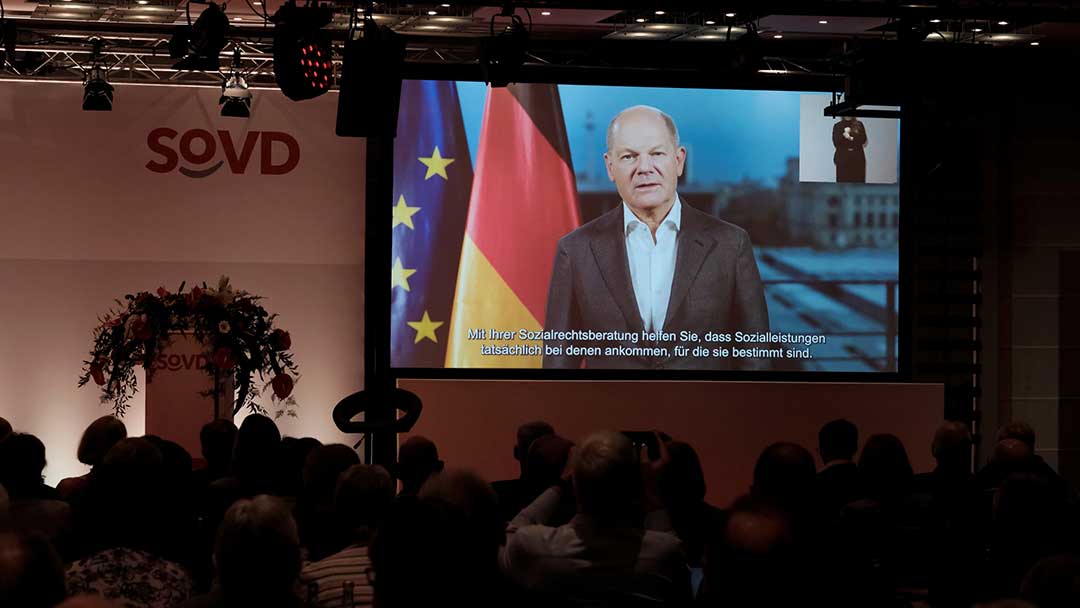 Vor diesem Themenschwerpunkt wandte sich Bundeskanzler Olaf Scholz (SPD) per Videobotschaft an die Delegierten des SoVD sowie die Gäste der Veranstaltung und wünschte ihnen eine erfolgreiche Bundesverbandstagung. Dabei lobte er den Einsatz des Verbandes. Angesichts der großen Herausforderungen sei der SoVD „ein starker Partner“ für die Politik. Durch die Sozialrechtsberatung gelange das Geld dorthin, wo es tatsächlich gebraucht werden. Einen besonderen Dank richtete er an die ehrenamtlich Aktiven des Verbandes: „Sie halten unser Land zusammen. Dafür danke ich Ihnen von ganzen Herzen.“ Mit seinem Engagement trage der Verband zu einer „Gesellschaft des Respekts“ bei.