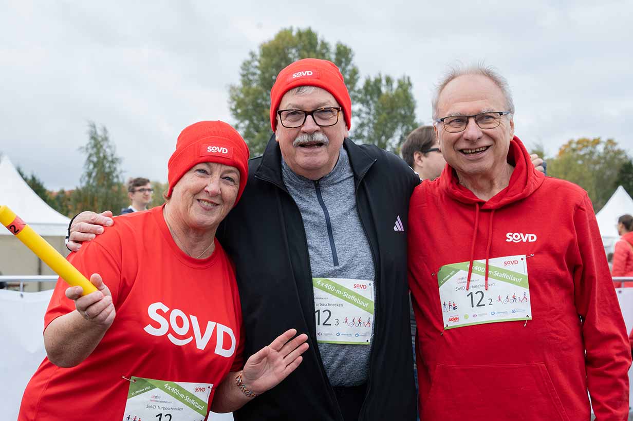 Bunt und inklusiv ging es danach beim Staffellauf weiter. Über 4 × 400 Meter waren hier Teamwork und ein wenig Ausdauer gefragt. Gleich mehrere Mannschaften gingen für den SoVD an den Start: die SoVD-Turboschnecken mit Michaela Engelmeier, dem Verbandsratsvorsitzenden Bernhard Sackarendt, seinem Stellvertreter Alfred Bornhalm und Laura Priebe, persönliche Referentin von Michaela Engelmeier, außerdem Staffeln der SoVD-Jugend, der Abteilung Sozialpolitik im Erich-Kuttner-Haus und des SoVD-Kreisverbandes Spandau. Die antreibenden Beats der ufa-Trommelgruppe sorgten beim Rennen noch einmal für den Extraschuss Motivation.
