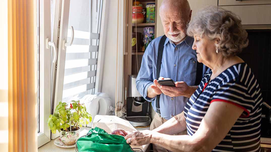 Älteres Ehepaar steht mit Einkäufen in der Küche.