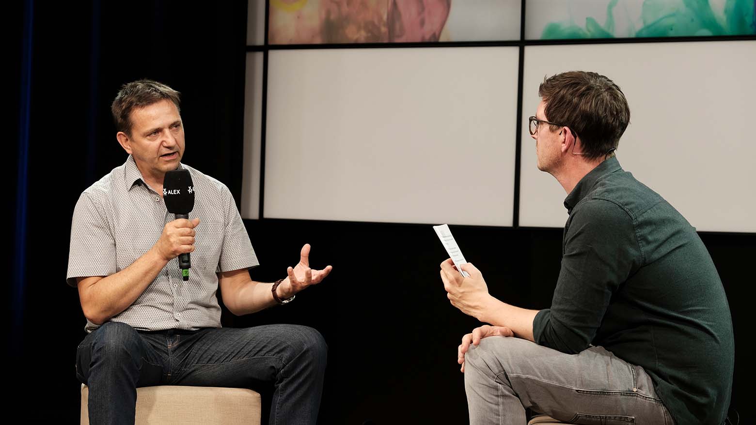 Zwei Männer mit Mikrofonen im TV-Studio