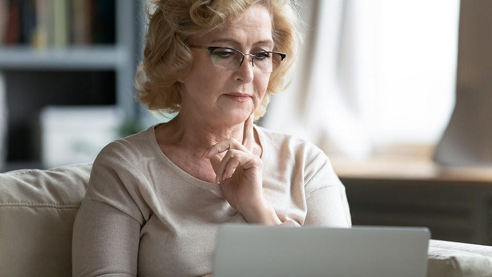 Frau blickt nachdenklich auf einen Laptop