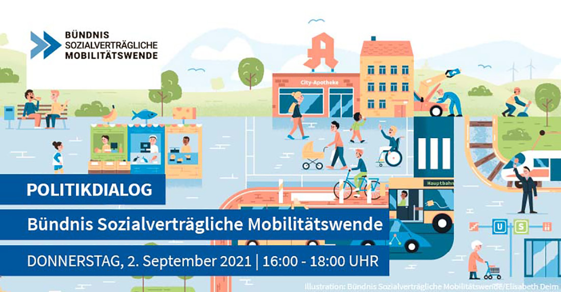 Am Donnerstag, den 2. September, von 16 bis 18 Uhr lädt das Bündnis die Politik ein, ihre Visionen für eine sozial gerechte Mobilitätswende zu diskutieren. Mit dabei sein werden: Sören Bartol (SPD), Anton Hofreiter (Bündnis 90/DIE GRÜNEN), Lukas Köhler (FDP), Amira Mohamed Ali (DIE LINKE) und Andreas Jung (CDU). Das Bündnis wird vertreten durch Christine Behle (ver.di), Kai Bliesener (IG Metall), Michael Groß (Präsident AWO) und Kerstin Haarmann (VCD). Der Politikdialog findet digital statt.
