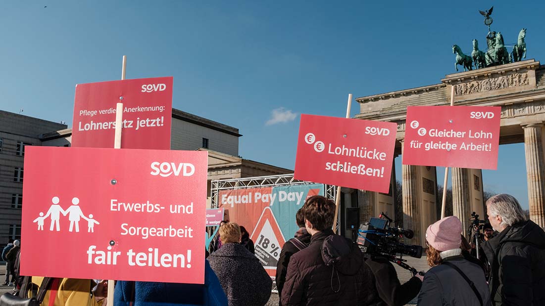 In diesem Jahr stand der Aktionstag unter dem Motto „Höchste Zeit für Equal Pay“. Vor dem Brandenburger Tor in Berlin fand eine Kundgebung des Deutschen Gewerkschaftsbundes (DGB) statt, an der sich auch der SoVD beteiligte. SoVD-Plakate verdeutlichten Forderungen des Verbandes wie „Gleicher Lohn für gleiche Arbeit“, „Lohnlücke schließen“ oder „Pflege verdient Anerkennung: Lohnersatz jetzt!“. Die SoVD-Vostandsvorsitzende Michaela Engelmeier bekräftigte die Ziele des SoVD. Sie stellte fest: "Frauen leisten deutlich mehr unbezahlte Sorge-Arbeit als Männer, kümmern sich um Familie, Kinder und Angehörige. Diese Ungleichheit zieht weitreichende negative Folgen nach sich - finanziell und bei den Rentenansprüchen. Es ist Zeit für Veränderung! Wir fordern eine Weiterentwicklung des Entgelttransparenzgesetzes zu einem starken Lohngerechtigkeitsgesetz."