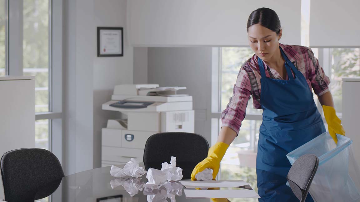 Frau in Putzkleidung räumt in einem Büro auf.